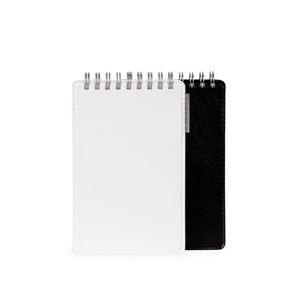 Bloco de anotações com capa em couro sintético, porta-canetas em plástico e encadernação Wire-O. Contém aproximadamente 100 folhas brancas sem pauta.