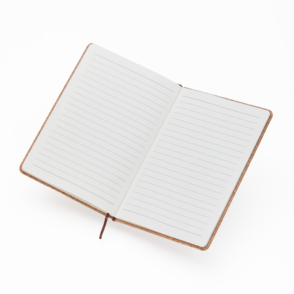 Caderneta de cortiça, contém aproximadamente 80 folhas amarelas com pauta, marcador de página em cetim e elástico para lacre.