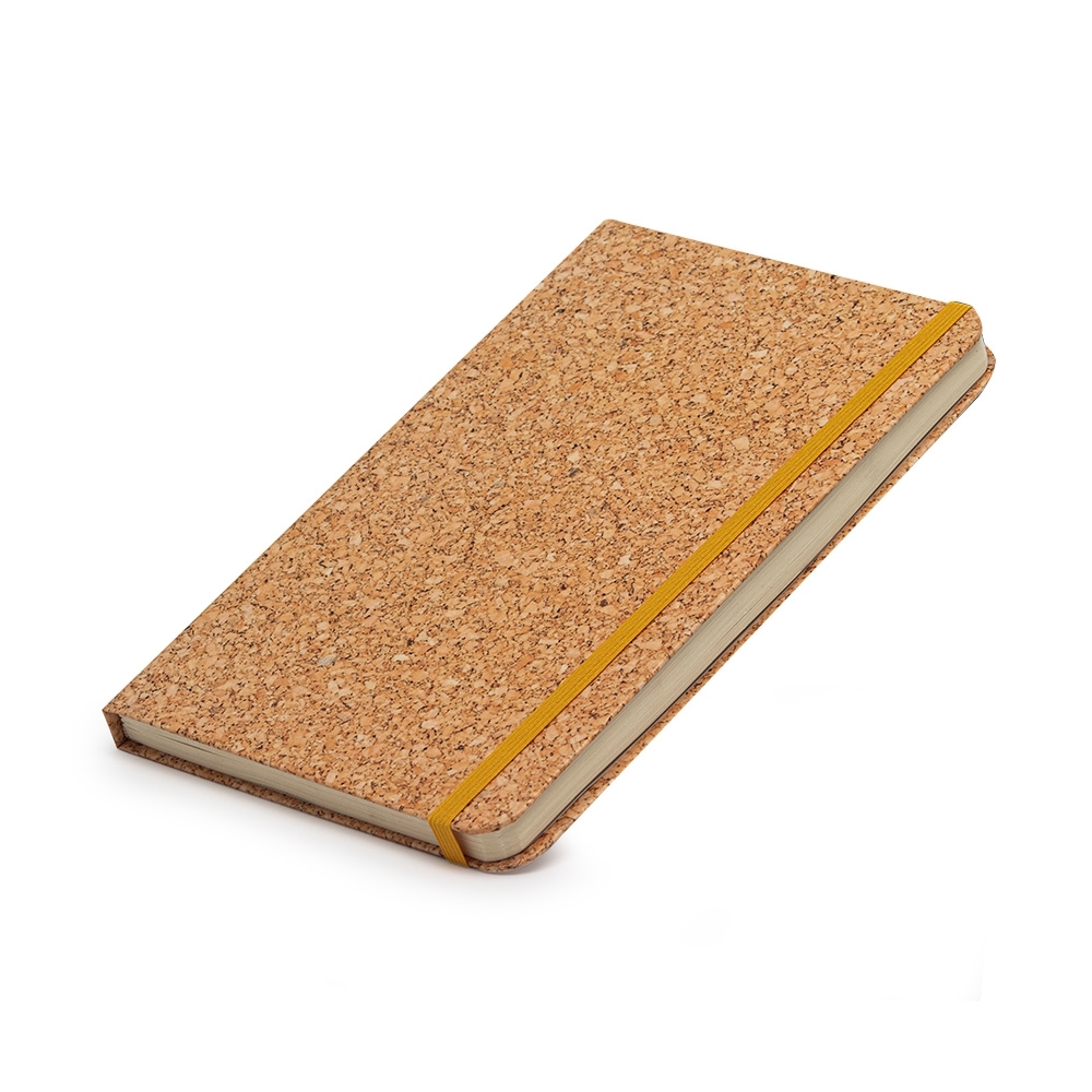 Caderneta em papel couche 150g, contém aproximadamente 72 folhas amarelas com pauta e 16 folhas sem pauta, marcador de página em cetim, elástico para lacre e compartimento em papel para documentos ou anotações.
