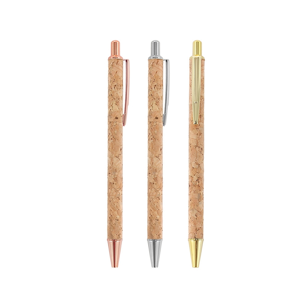Caneta de cortiça com carga esferográfica azul 1.0mm e acionamento por clique. Clipe metálico, acionador e ponteira plástica.