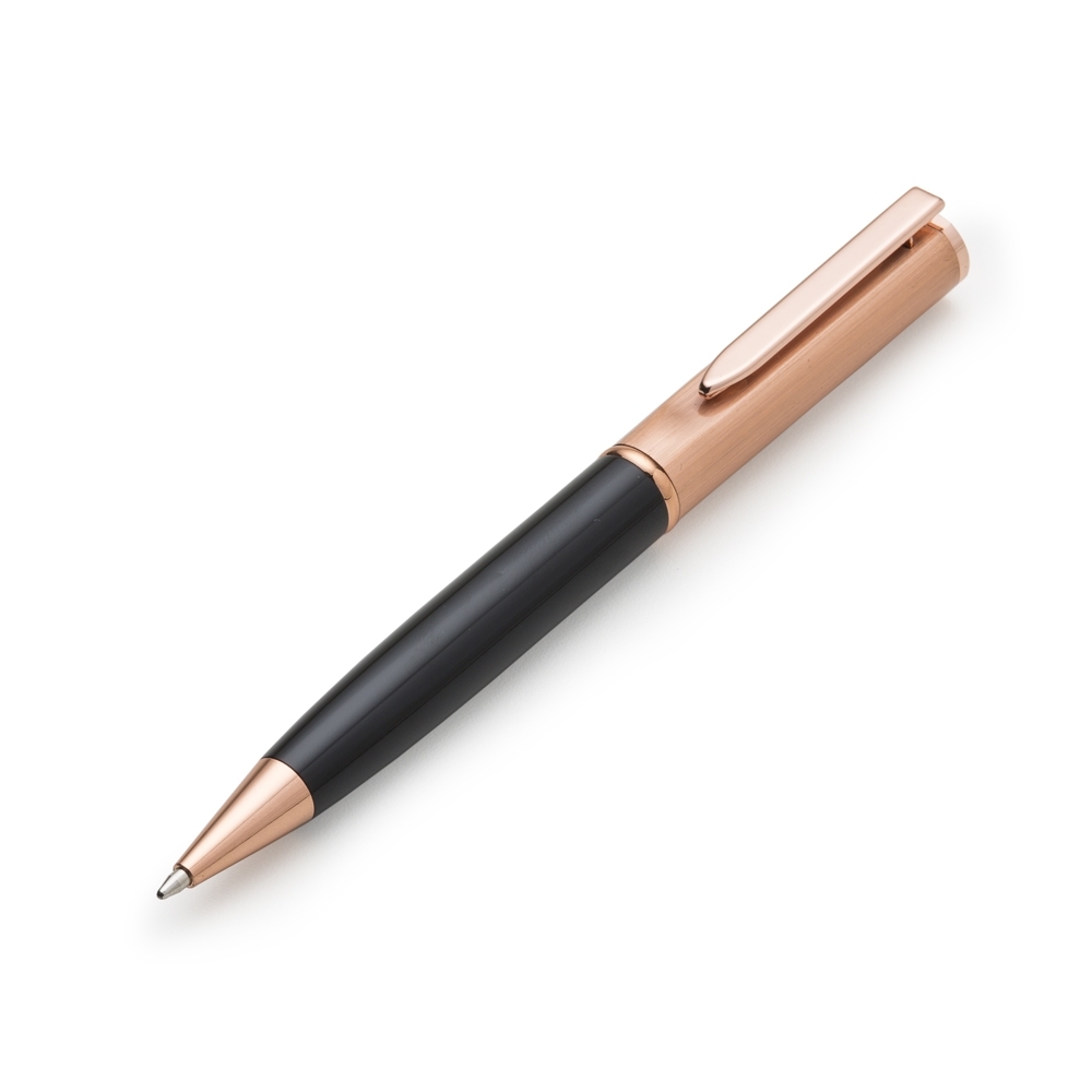 Caneta metal cobre com detalhe inferior colorido. Clip metal com e detalhe circular na ponta superior, possui anel central, carga esferográfica azul 1.0 mm com acionamento por giro. OBS.: PEDIDO APENAS MÚLTIPLO DE 50 PEÇAS!