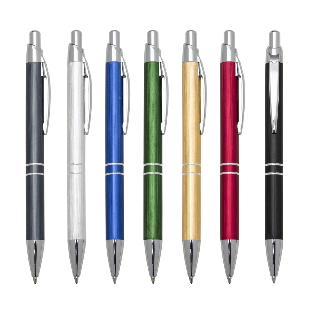 Caneta metálica com carga esferográfica azul e acionamento por clique.
