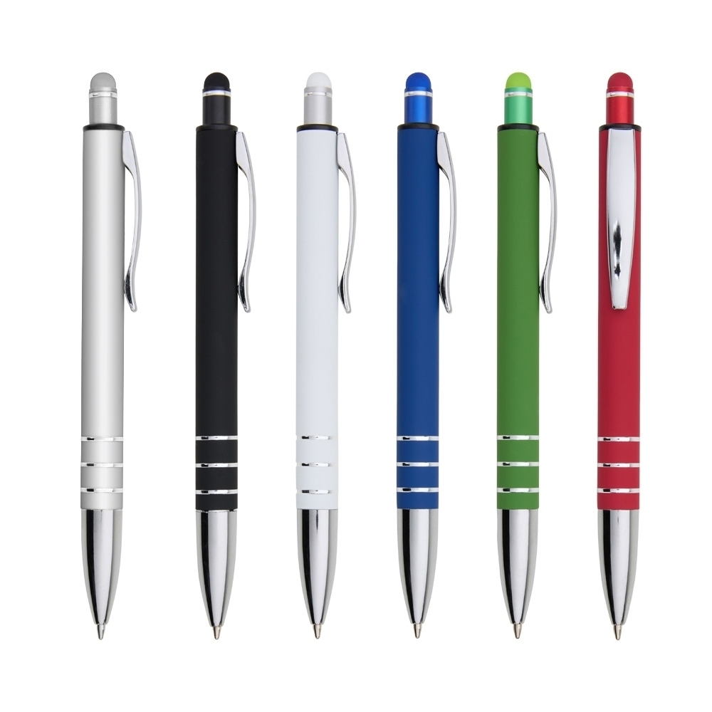 Caneta metálica touchscreen com acabamento emborrachado, acionamento por clique e carga esferográfica azul 1.0mm.