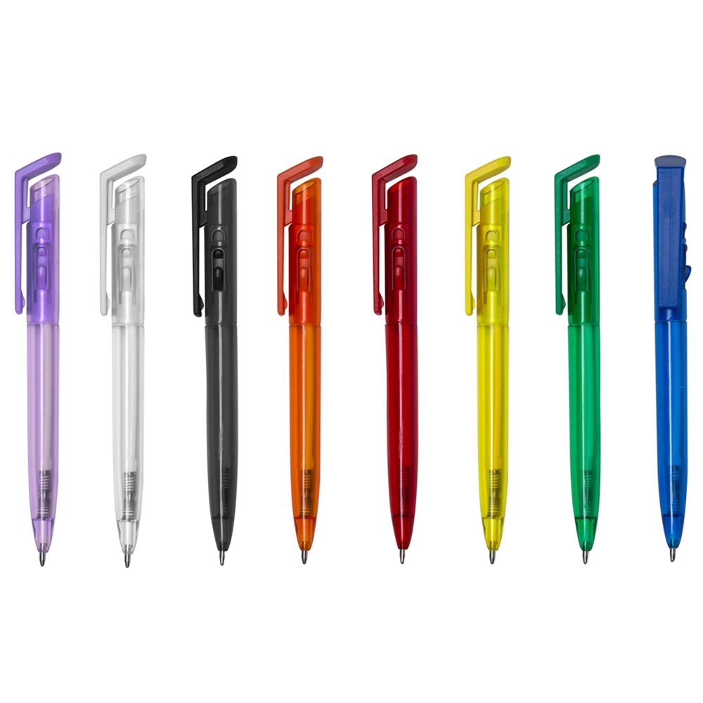 Caneta plástica com carga esferográfica azul 1.0 mm e acionamento por clique.