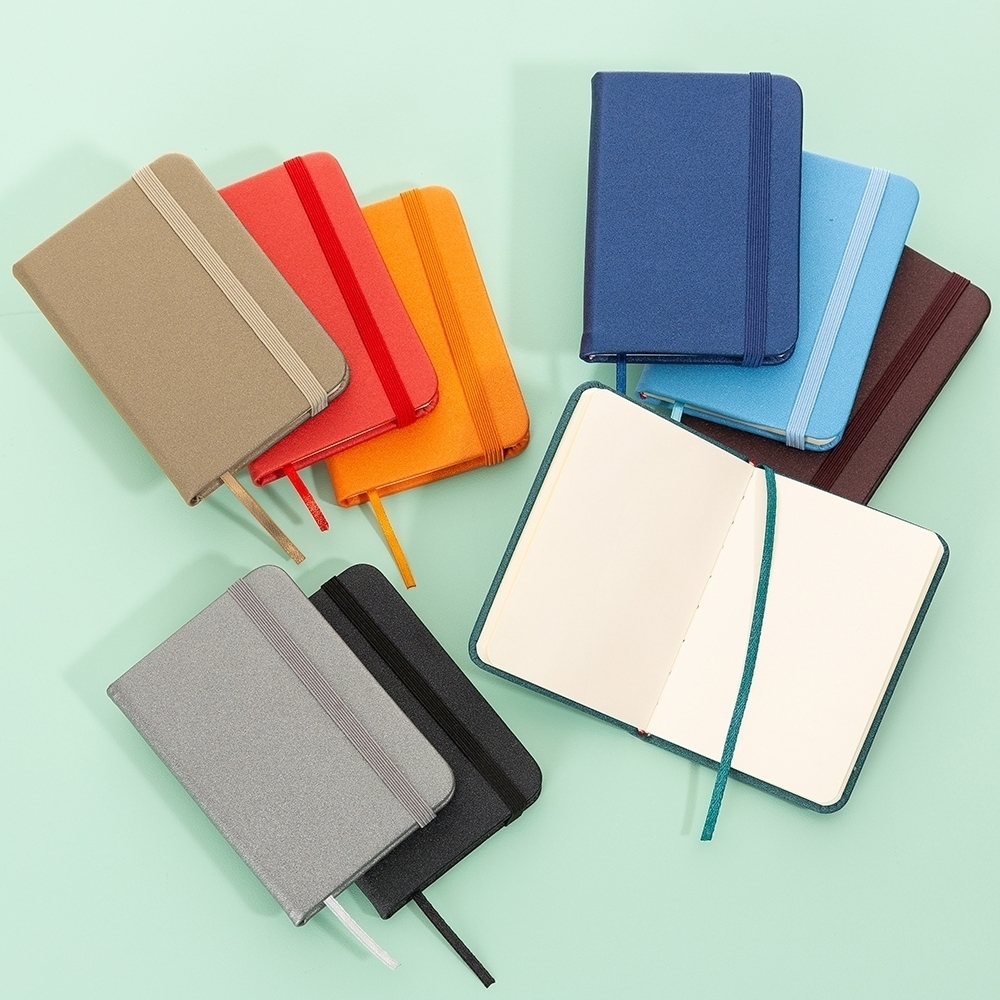 Mini Caderneta em material sintético brilhante com marcador de página em cetim e fita elástica para fechar. Contém aproximadamente 80 folhas amareladas sem pauta.