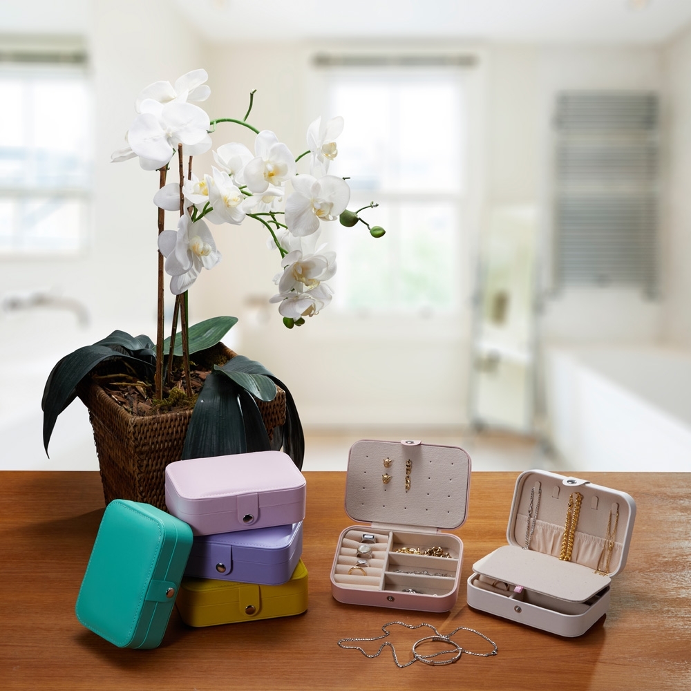 Porta-joias de couro sintético com revestimento aveludado. Possui compartimentos internos para anéis, pulseiras, colares e placa para brincos.