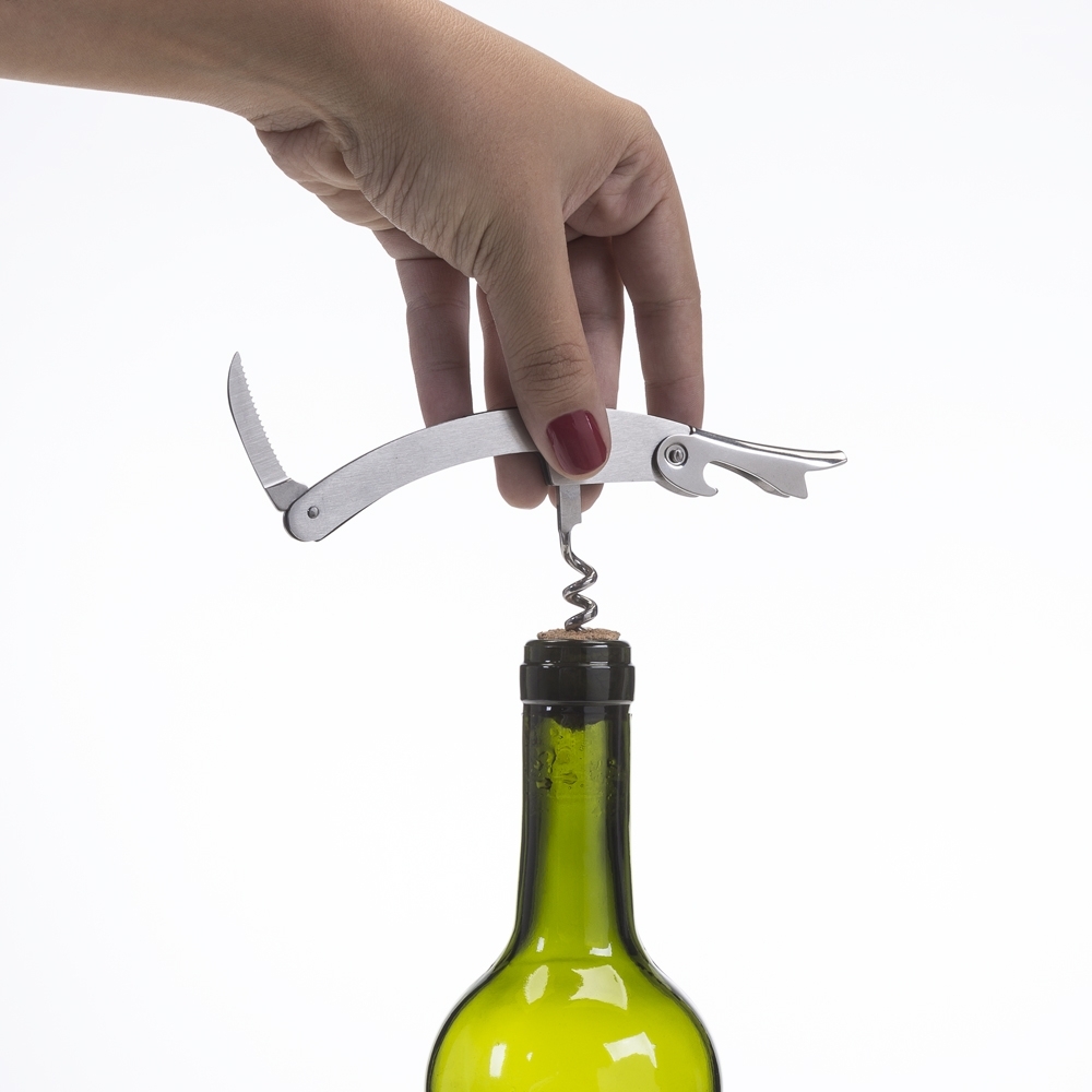 Saca-rolhas metálico com lâmina de corte e abridor de garrafa.