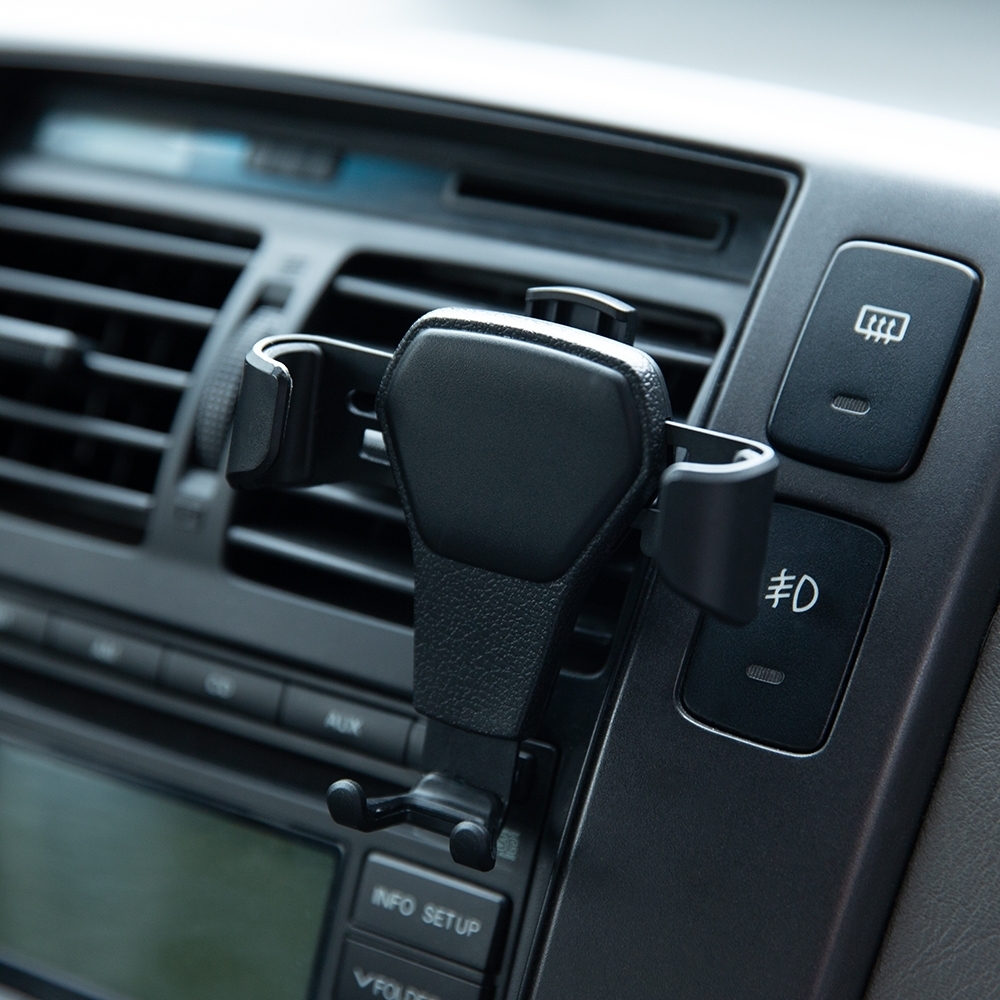 Suporte veicular gravitacional com hastes de ajuste automático e garra de encaixe.